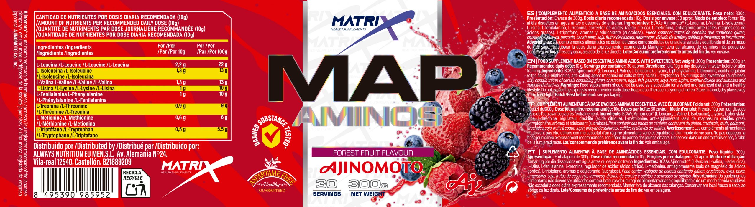 Este producto utiliza la matriz patentada de Master Amino Acid Pattern (MAP), una combinación precisa de los 9 aminoácidos esenciales (EAA) en proporciones específicas que tu cuerpo necesita, pero no puede producir por sí mismo.