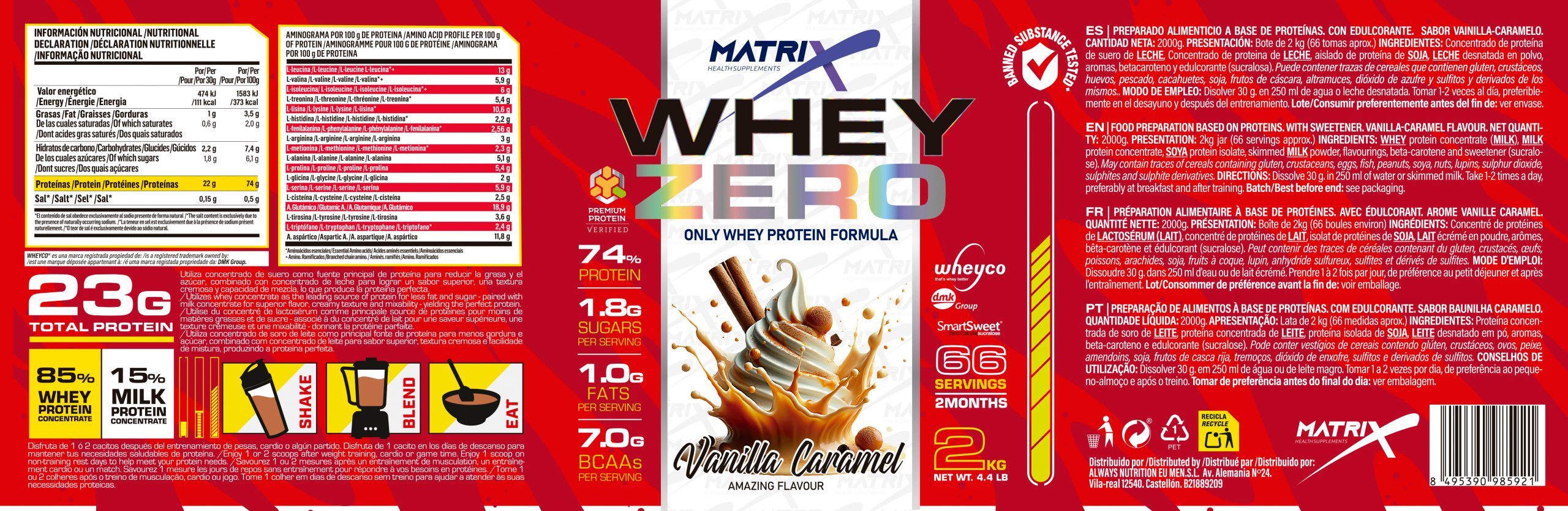 MATRIX WHEY ZERO está formulada para atletas y entusiastas del fitness que buscan la máxima calidad. Nuestra fórmula de Vainilla de 2 kg asegura una fuente premium de proteína con un sabor que querrás tomar todos los días.
